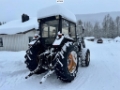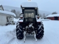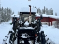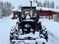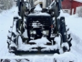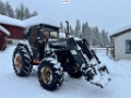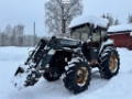 Traktoren er utstyrt med frontlaster.
